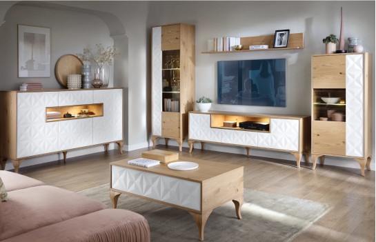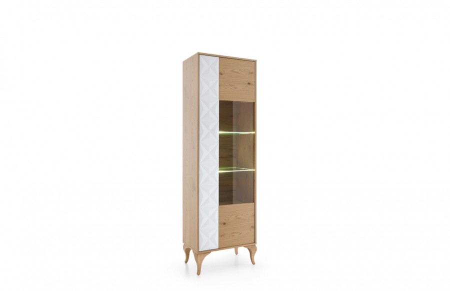 Witryna DIAMENT - to nowoczesna bryła i gwarancja funkcjonalności oraz stylu. Moduł został tak przemyślany, by doskonale wykorzystać dostępną przestrzeń, zapewniając jednocześnie maksimum wygody użytkowania. Unikalny design witryny DIAMENT tworzy otwartą przestrzeń wewnątrz mebli, dając Ci dużą swobodę w eksponowaniu ulubionych dekoracji oraz pamiątek. Stworzono ją z drewna dębowego, okleinowanej płyty meblowej oraz matowej okleiny PCF na płycie MDF. Dostępna w dwóch kolorach: bieli i graficie, pozwala na kreowanie różnych aranżacji. Dzięki zmiennym odcieniom światła oraz unikalnemu wzorowi na froncie, meble z kolekcji DIAMENT nabierają charakteru oraz wyjątkowości. Gięte nogi unoszą mebel i nadają mu lekkości, tworząc równowagę pomiędzy designem a praktycznością. Odkryj nowoczesny styl w kolekcji DIAMENT i podkreśl swój wyjątkowy gust w Twoim wnętrzu.