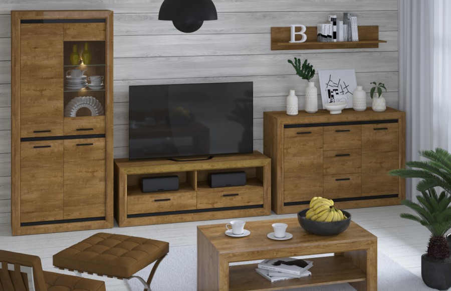 Witryna BALTICA 2501 - to klasyczny model, który doskonale pasuje do salonu, pokoju dziennego, domowego biura i jadalni. Wyjątkowy design tego mebla wyróżnia się starannym wykończeniem i ciepłą, naturalną kolorystyką. Korpus i fronty w odcieniu Dąb Lefkas doskonale kontrastują z minimalistycznymi uchwytami i czarnymi wstawkami. Dodatkową elegancję dodają widoczne rysunki słojów, delikatnie przyciemniane szkło w witrynach oraz opcjonalne dwupunktowe oświetlenie LED. Najważniejszym atutem tego mebla jest jego pojemne wnętrze - witryna posiada cztery zamykane szafki z półkami wewnątrz, a także dwie półki za przeszklonym frontem. W kolekcji BALTICA znajdziesz również inne elementy, takie jak szafa ubraniowa, komoda, szafka RTV i wisząca półka.