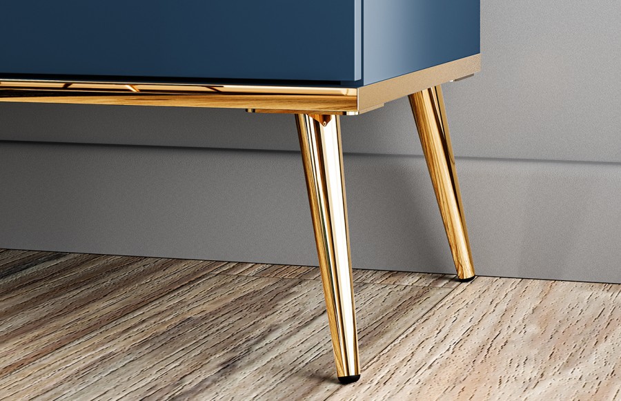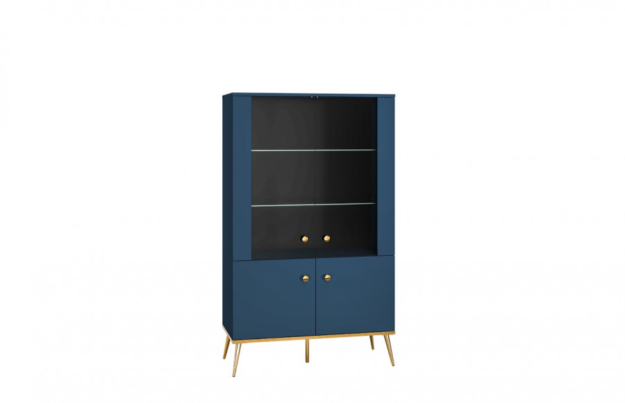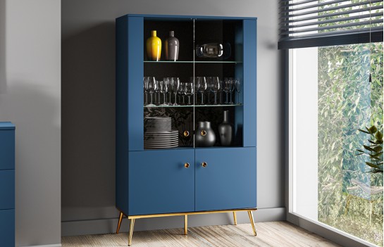 Witryna MARINE 02 - bez wątpienia przypadnie do gustu wielbicielom stylu glamour. Ta luksusowa witryna została wykonana z najwyższej jakości płyty MDF. Niezwykle popularny obecnie odcień głębokiego granatu nada aranżacji elegancji i designerskiego wyglądu. Skośne nóżki oraz uchwyty w kolorze złota nadają efektownego wizerunku. To idealne rozwiązanie dla osób, które pragną podkreślić urok swoich cennych pamiątek w unikatowy oraz niebanalny sposób. Wszystkie szafki wyposażono w system cichego domyku, który zapewni płynne i bezszelestne zamykanie drzwi. Aby jeszcze bardziej podkreślić urok produktów MARINE, producent wyposażył je w oświetlenie, które dostępne jest w standardzie. Meble sprawdzą się również w pokoju dziennym urządzonym w klasycznym stylu, tworząc unikatowy wystrój pełen elegancji oraz wdzięku. W kolekcji mebli MARINE znajdziesz również meble potrzebne do urządzenia salonu i jadalni.