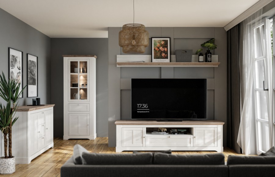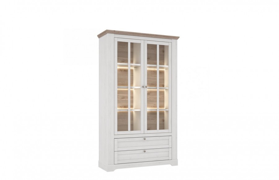 Witryna ILOPPA - to elegancki mebel, idealny do przechowywania i eksponowania zastawy, ozdób i pamiątek rodzinnych. To niebanalna dekoracja dla rustykalnego salonu lub jadalni, doskonale pasująca do przestronnych domów. Główne cech witryny ILOPPA to dwa przeszklone fronty, dwie szuflady oraz system cichego domyku. Ta szeroka witryna wykonana jest z wytrzymałej płyty meblowej. Jej korpus ma odcień Dąb Śnieżny, a wieniec Dąb Nelson. Metalowe uchwyty w kolorze nikiel szczotkowany dodają elegancji. Szklane elementy są wykonane z hartowanego szkła, a oświetlenie LED skupia się na 6 punktach, podkreślając piękno przechowywanych przedmiotów.